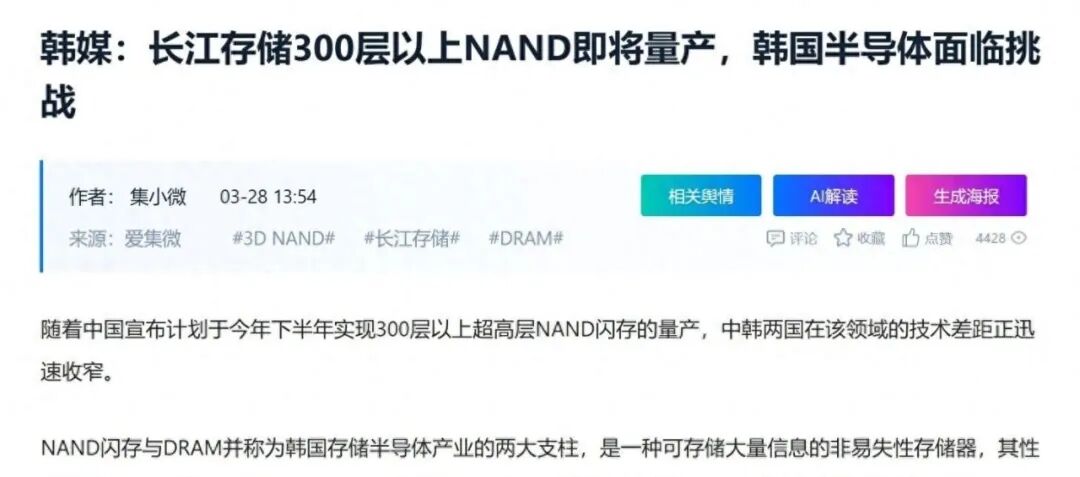 技术参数显示,长江存储 300 层以上 NAND 堆叠密度、存储容量、读写速度已超越三星 286 层产品,与 SK 海力士 321 层产品持平,部分指标领先,国产存储芯片技术首次跻身全球顶尖行列。