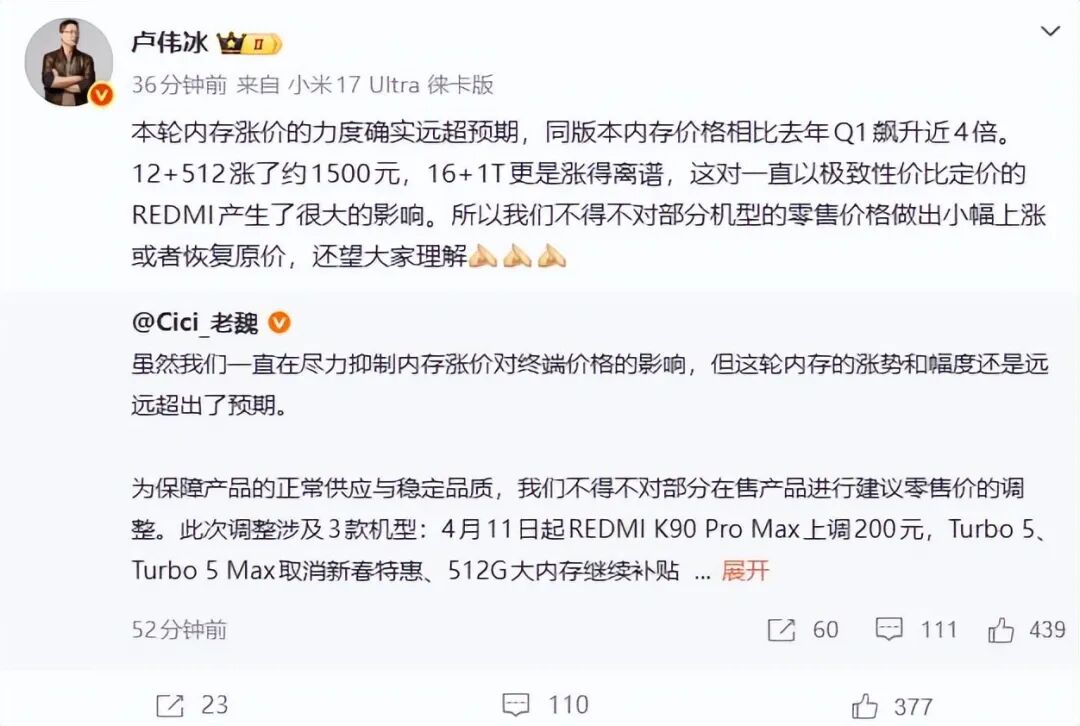 面对内存缺货且大幅涨价,小米卢伟冰发文称,本轮内存涨价的力度远超预期,同版本内存价格相比去年Q1飙升近4倍。12+512涨了约1500元,16+1T更是涨得离谱。