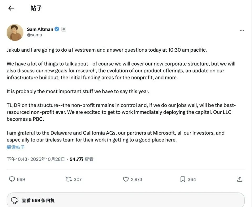 随后,奥特曼还与首席科学家雅库布·帕乔基举行直播问答,详细阐述“新OpenAI”未来的发展蓝图。直播重点议题将涵盖 OpenAI新的研究目标,包括对“AI研究员”的激进时间表;产品组合的进化;基础设施建设的最新进展,该项目涉及万亿美元级的财务承诺;以及非营利部门将立即部署资本的初始资助领域等。
