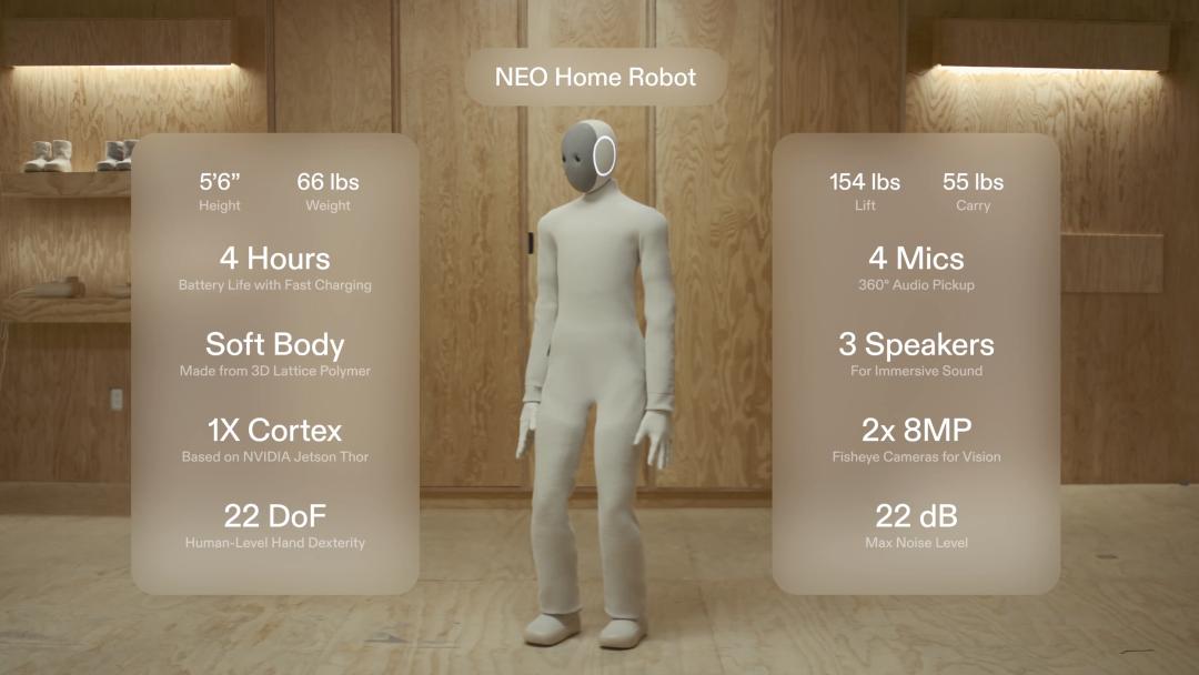 其中,NEO是双足机器人,承担家庭与服务场景的主要落地任务。