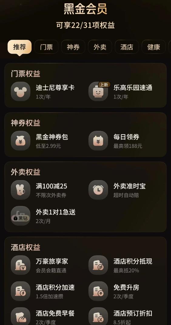 美团这边针对那些年消费极高的黑金和黑钻会员,酒旅权益上也可谓下足了血本,上海迪士尼、乐高免费尊享卡或者速通票,免费升房、早餐、取消等权益一应俱全。