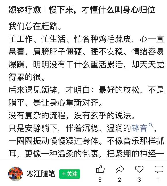 有网友说自己深度参与多次颂钵疗愈,就是静静躺着,感受声音的包裹,她在忙碌工作之余找到了片刻宁静,懂得了什么叫“身心归位”。