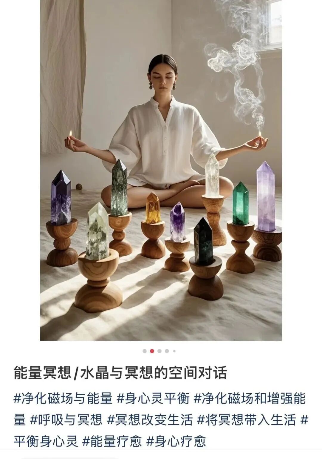 最简单的疗愈是冥想,自己坐床上就能搞定。想增加点仪式感,可能就得破费了,冥想坐垫、冥想服、芳香精油、水晶柱、手串等物品配齐了,少则过百,多了就没法计算了。以上每样物件都有售价过万的产品。