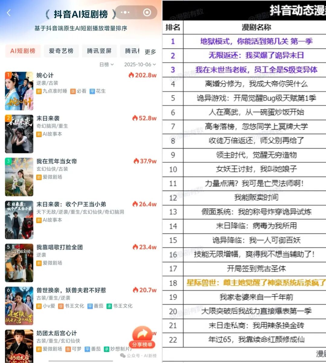 在新榜发布的“抖音AI短剧榜”中,我们还看到了另一部题材近似的作品《奶团太后宫心计》,应该是希望复制《奶团太后三岁半》的成功。我们可以把这份榜单视为观察目前AI真人短剧的一个“横截面”,与AI漫剧的热门榜单既有相通之处,又有着鲜明的反差。