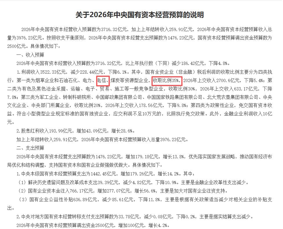 数天前,财政部发布《关于2026年中央国有资本经营预算的说明》,公布了国有资本收益上缴的最新比例。总体来看,这是我国建立国有资本收益上缴制度以来调整幅度最大的一次。经过此番调整,电信行业从此前的第二类被划入第一类,与烟草、石油石化、电力、煤炭等行业并列,国有资本收益上缴比例从20%提升至35%。