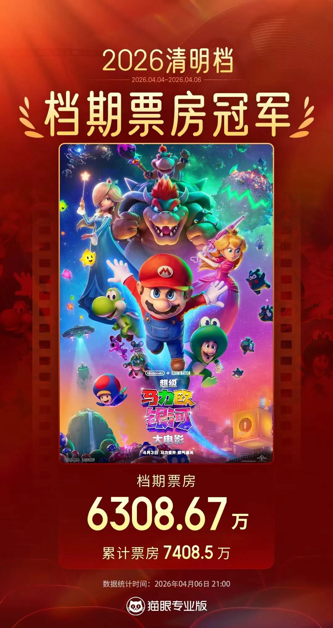 档期冠军如标尺,它的票房量级直接划定了整个档期的水位线。今年清明档的档期冠军《超级马力欧银河大电影》,截至档期结束票房仅为6308万。