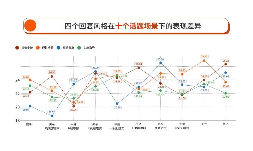 在对 1408 条长辈回复进行系统性内容分析后,研究团队进一步总结出老年人回复的四种回应风格:共情支持型、理性劝导型、经验分享型与实用指令型。