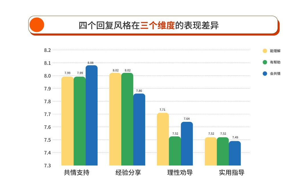 在对评分和反馈的数据进行深入的混合分析后,研究团队得出了三项核心发现。首先,老年人在不同生活场景下展现出明显的回应风格偏好;其次,共情支持型表达成为最受欢迎的回答类型;第三,老年人对“理解”、“帮助”、“共情”三项维度的评价高度一致,表现出整体性判断的特征,即他们将“被理解”、“被帮助”与“被共情”视作同一体验,而非割裂的评价维度。