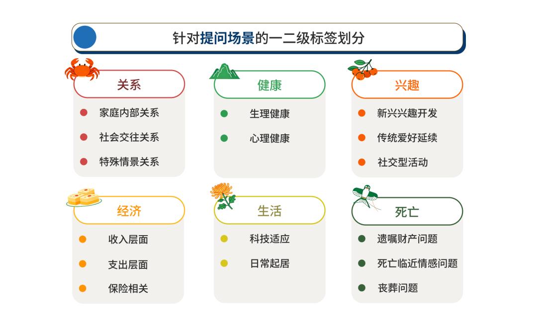 为精准捕捉需求特征,团队构建了多层级场景分类体系:在一级主题层面,明确划分出人际关系处理、身心健康维持、兴趣社交活动、经济社会保障、科技生活支持、死亡议题关注六大类别。基于一级主题,进一步拆解出 16 个子类,例如 “人际关系处理” 下细分 “亲子关系”、“邻里互动” 等。最终,通过三级标签细化为 37 个具体项。