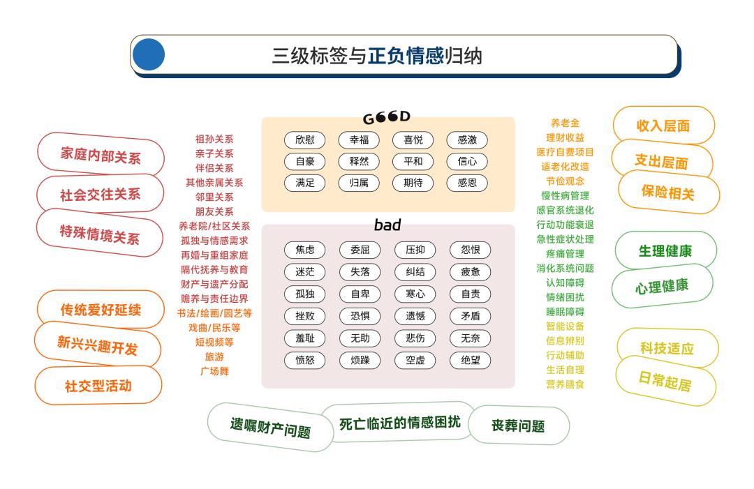 在场景分类之外,研究团队特别引入 “情感维度” 标注,构建 “场景 + 情感” 的双重分析框架,以破解老年人需求表达中 “功能诉求与情感诉求绑定” 的核心问题。值得注意的是,老年人的提问常呈现 “积极与消极情绪交织” 的特征,需通过细致分析精准识别 。