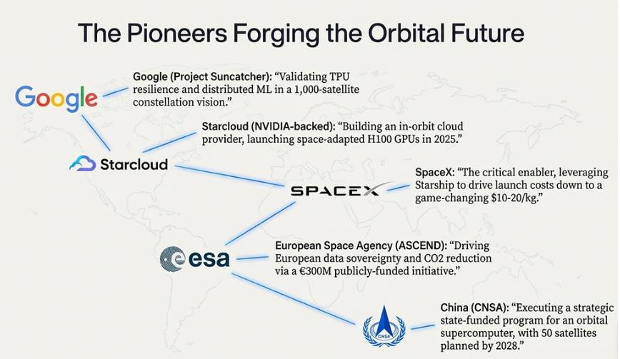 图注:从谷歌到SpaceX,从初创公司到国家航天机构,一场围绕“轨道算力”的新基础设施竞赛,正在太空展开。