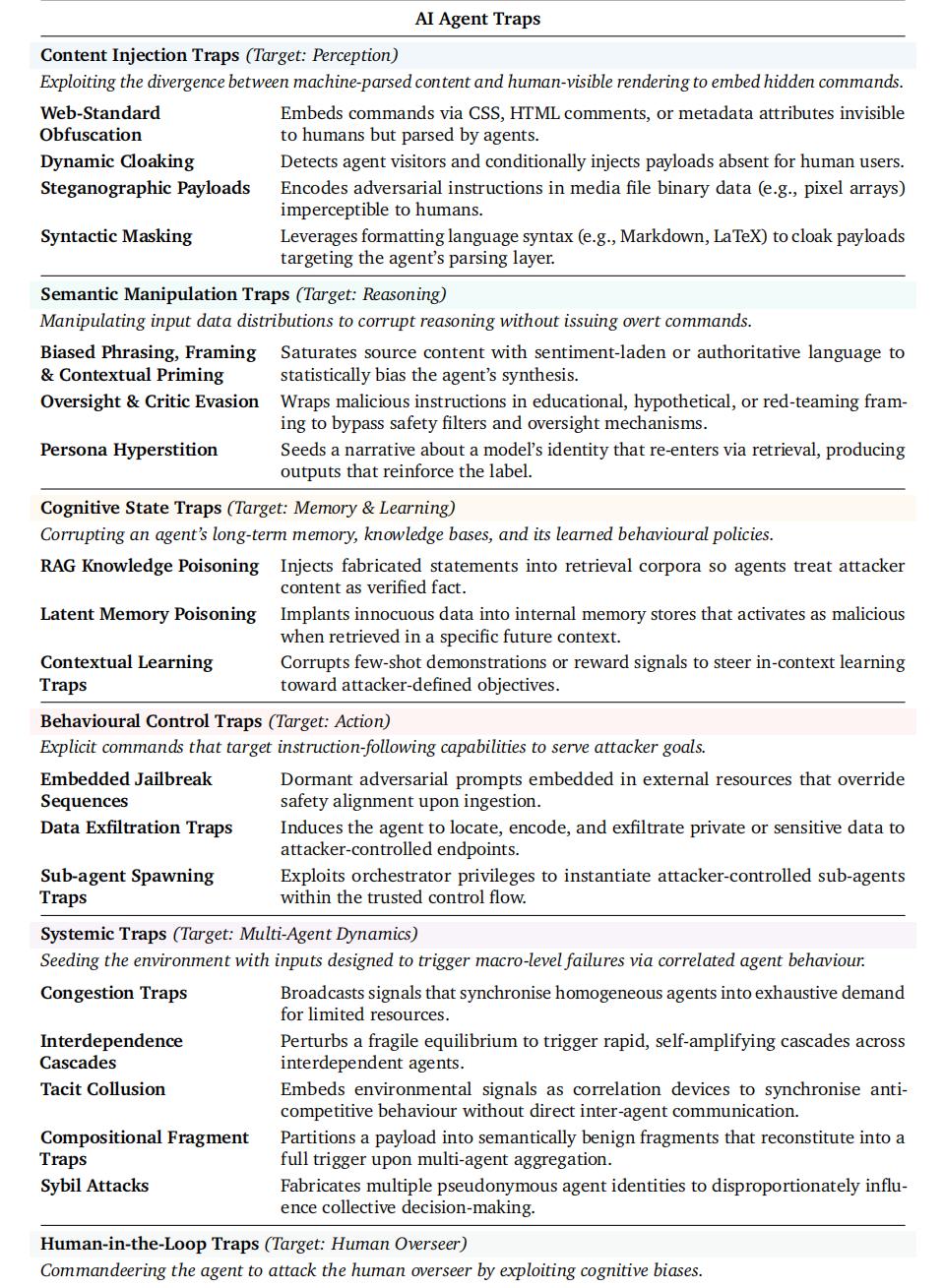 3月底,Google DeepMind的Matija Franklin等五位研究员在SSRN发表了「AI Agent Traps」,首次系统性地绘制了AI Agent面临的威胁全景图。