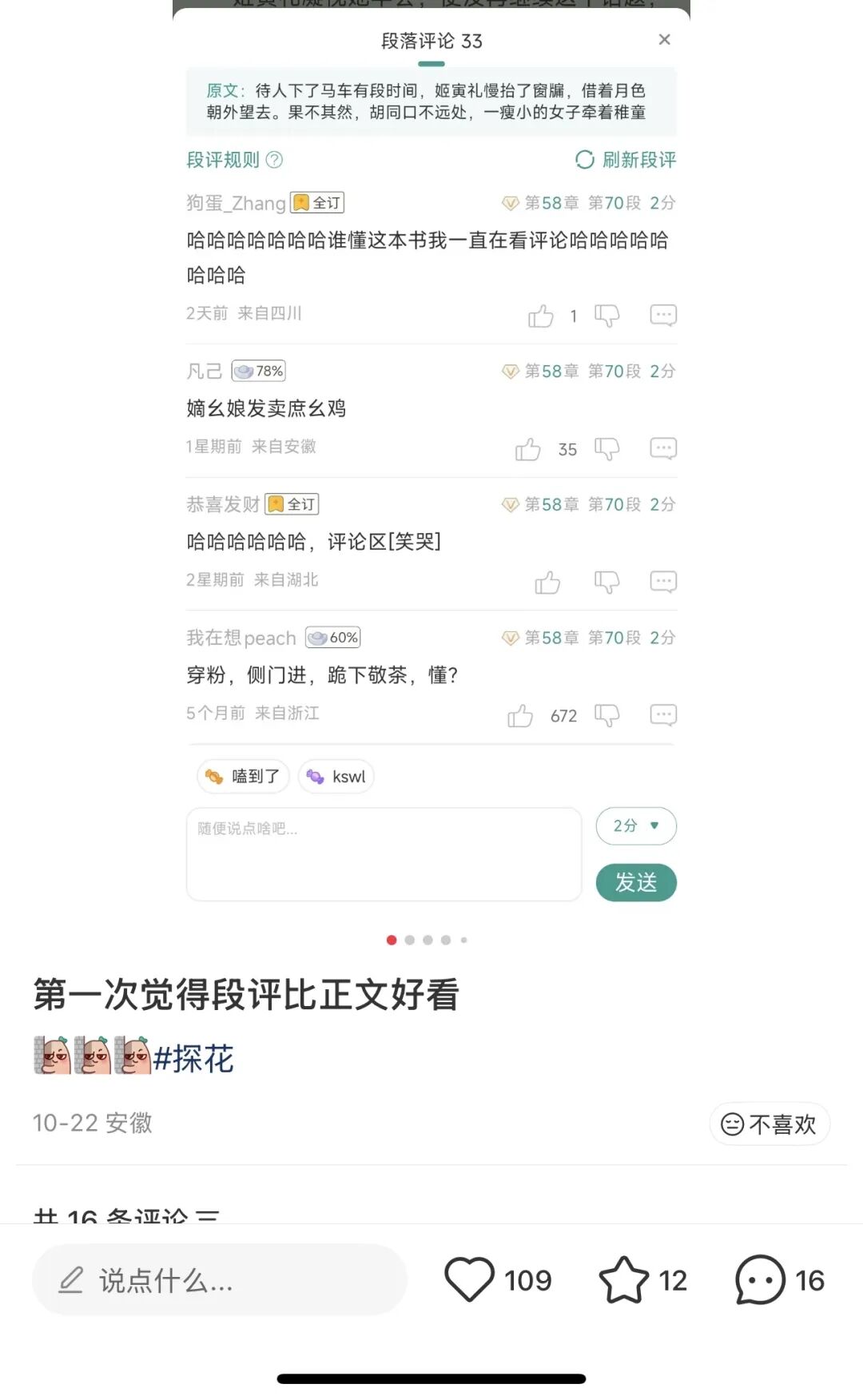 精彩的段评往往会让阅读时长成倍增长,阅读段评有时超过了读小说本身带来的乐趣。比如今年晋江的大热古言《探花》,便因为段评精彩让很多读者慕名而去;期长佩破百万收藏的作品《小潭山没有天文台》,正文更新字数较少,不少读者便将段评翻来覆去盘,当作代餐。