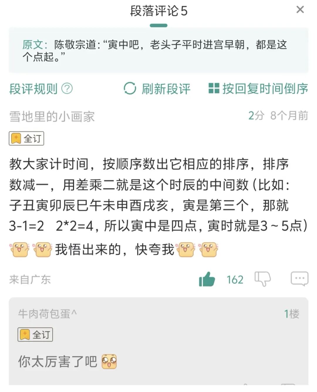 除了搞笑整活儿,段评区也肩负着科普、深度解读的担子。古言的段评区会有读者教授时辰的换算方法,西幻背景的《诡秘之主》的段评区,热心读者们会贴心备注货币公式,还不乏解读派从文本细节里挖掘隐藏的剧情密码与人物内核。部分作者还会在段评中补充注释或彩蛋,提升阅读体验。起点的段评可以开启图片与语音功能,和仅能发文字段评的“原始”晋江相比又是另一重天地。