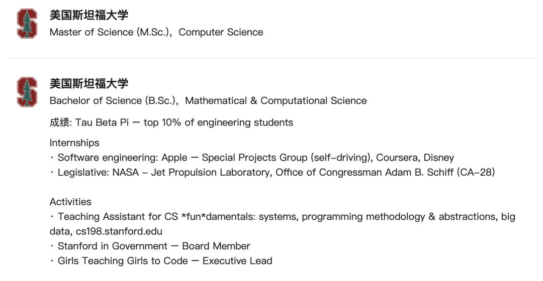 学业上,她是个标准的斯坦福学霸,本科专业应用数学,以top 10%的成绩毕业。