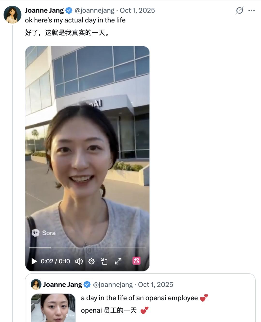 对AI工具的使用方式也很不一样,当大家在用Sora拍各种小动物搞笑视频时,Joanne用Sora拍起了vlog。