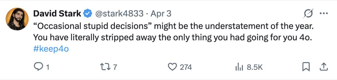 这一决定引发了前所未有的舆论海啸,「Keep 4o」的请愿活动一度掀翻了X平台,逼得奥特曼只好妥协,宣布付费用户可以切换回4o。