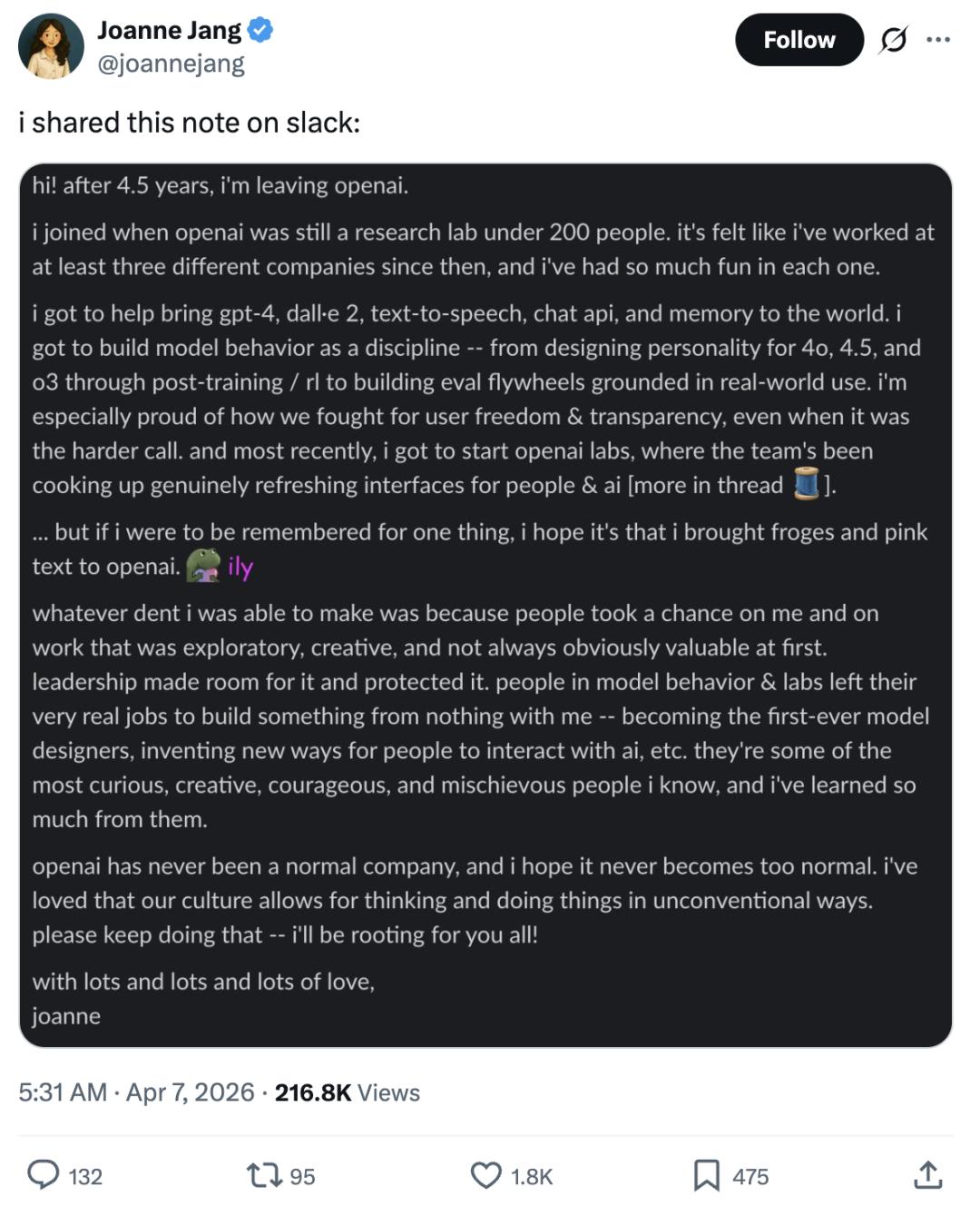 刚刚,「4o之母」Joanne Jang发了一篇长文,宣布结束自己在OpenAI四年半的旅程。