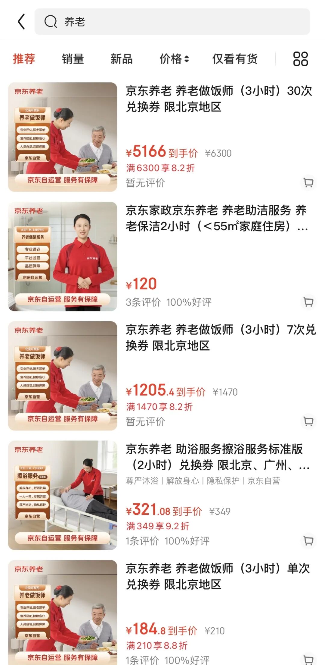 以上的价格来自于京东家政自营旗舰店。2026 年,京东正式入局养老赛道。2 月 28 日,京东集团与北京市民政局达成养老事业协同发展战略合作,标志京东居家养老服务进入规模化落地阶段。其实早在 2 月 15 日春节前夕,北京西城区就已经启动首批试点,截至 2026 年 3 月,服务已覆盖北京东城、西城、海淀等多个城区,并正在向全国近 50 个城市同步推进。