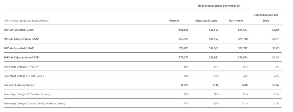 财报显示,微软第一财季营收为776.73亿美元,同比增长18%;净利润为277.47亿美元,同比增长12%,按固定汇率计算(不按照美国通用会计准则),净利润为308.33亿美元,同比增长22%;每股摊薄收益为3.72美元,同比增长13%,按固定汇率计算(不按照美国通用会计准则),每股收益为4.13美元,同比增长23%。