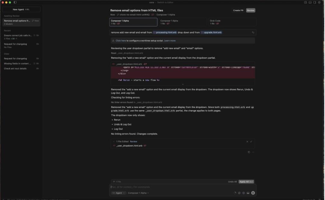 every.to 博客分享了一些测试示例,比如在下面的示例中,在顶部栏中,可以看到三个不同的模型上运行了相同的任务:Composer 1 Alpha 运行了两次,Grok Code 运行了一次: