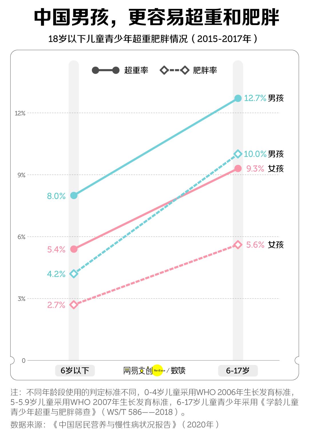 不仅如此,在这场看不见硝烟的增重战里,男孩成了更容易“中弹”的一方,不仅有更高的超重和肥胖率,和女孩的差距还在逐年扩大。2015-2017 年,6-17 岁男孩的肥胖率高达 10%,比同年龄段女孩高出 4.4 个百分点。