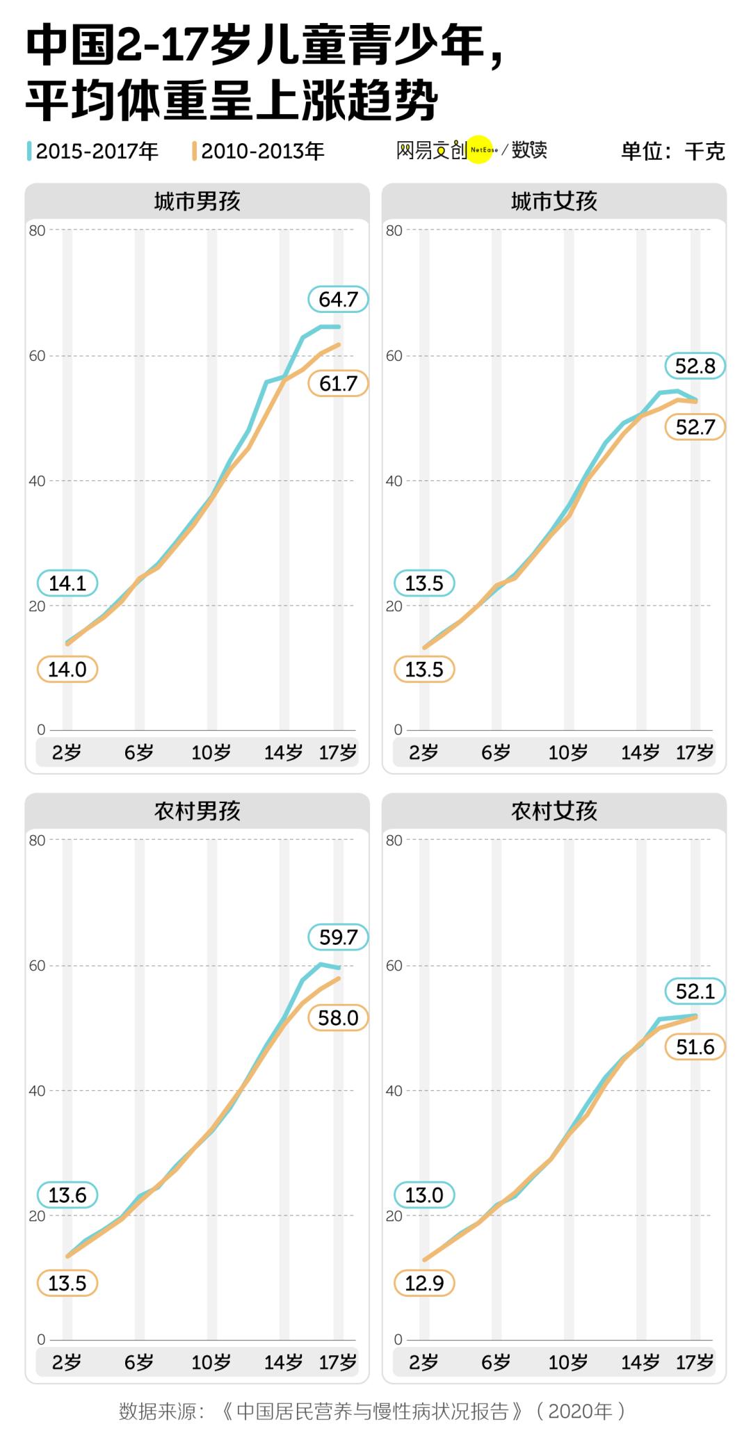 如果把时间线拉近,会发现与 2010-2013 年相比,2015-2017 年 6-17 岁男孩的平均体重增加了 1.4 千克,身高增长了 1.6 厘米;女孩则分别增了 0.6 千克和 1 厘米 [1]。