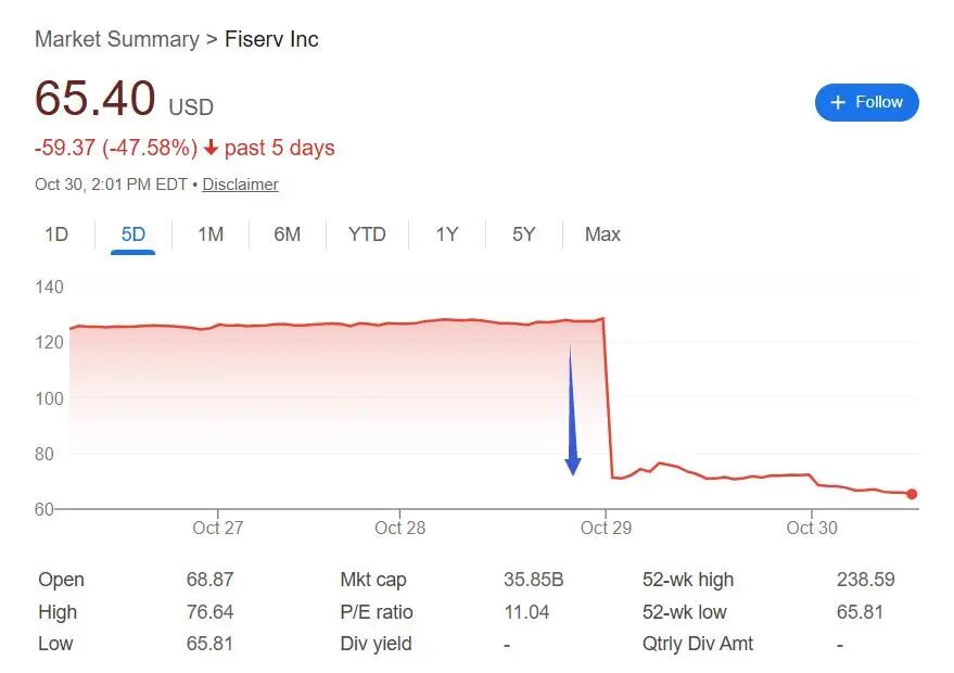 BTIG称,Fiserv的财报“惊人地糟糕”、“糟糕透顶”。William Blair的分析师在报告总写道:“鉴于我们认为三季度营收和每股收益逊色得让人震惊,以及突然的管理层过渡,我们不能再推荐Fiserv。”