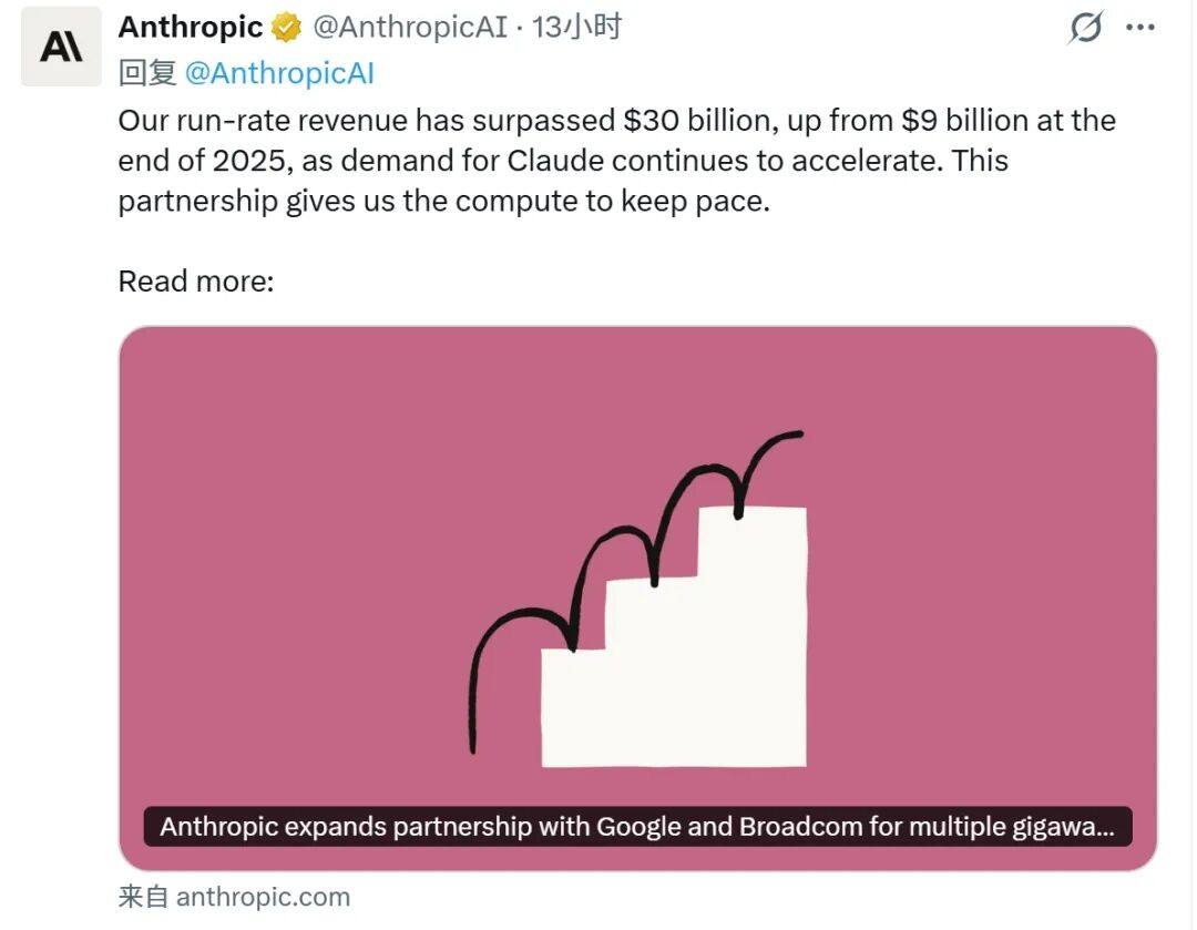 4月7日,美国大模型公司Anthropic对外公布,公司年化收入(ARR)已达到300亿美元。