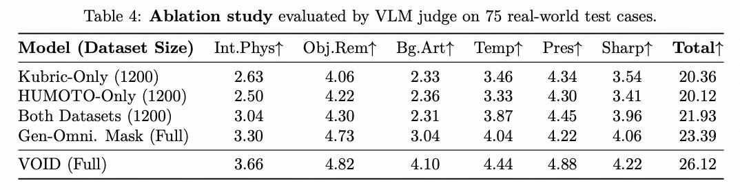 例如,VOID在除LPIPS外的所有指标上均为最佳。值得注意的是,LPIPS对局部位移敏感——如果模型正确模拟了物体掉落但速度略有偏差,反而可能比直接删除物体的模型得分更低。在视频级指标FVD和VLM裁判分数上,VOID与基线的差距最为显著,有力证明了其在物理合理性和语义一致性方面的优势。