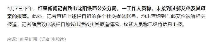 然而,就在各路媒体竞相报道此事、舆论愈演愈烈之际,事情却出现了戏剧性的反转。4月7日,郭艾伦通过个人微博正式发文,否认被诈骗的传闻,并表示自己一直在广东养伤,看厂房等事情更是子虚乌有。随后,郭艾伦工作室也通过微博辟谣此事。此外,据红星新闻向沈阳铁西公安分局求证,工作人员称未接到过郭艾伦及其母亲的报警。