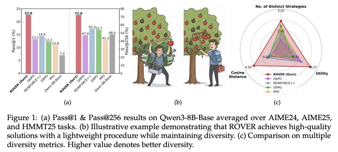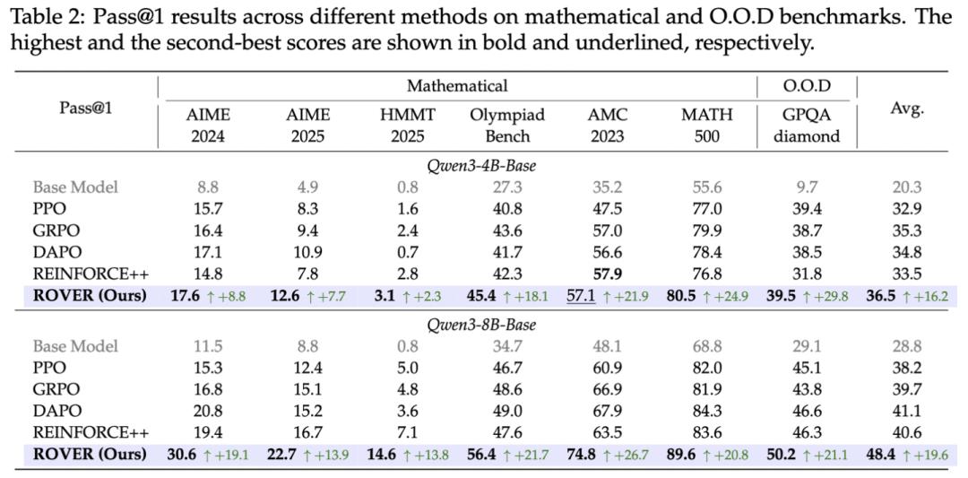在 Qwen3-8B-Base 模型上,ROVER 的 pass@1 在 AIME24 达 30.6(比最佳基线 DAPO 高 19.1 分);在 HMMT25 任务中,pass@1 从基线最高 7.1 跃升至 14.6(提升 106%)。