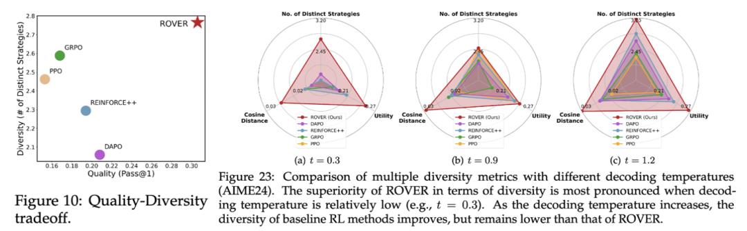 采用 LLM-as-Judge 方法评判所有方法生成的正确答案的推理内容多样性,ROVER 训练的策略多样性比基线平均提升 +17.6%,在 AIME24 上发现更多独特解题路径。在其他多样性指标如余弦距离(cosine distance)与利用率(utility)等,ROVER 在不同温度下仍表现出一致的高多样性。