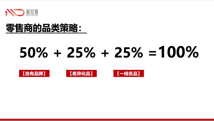 我认为,零售商未来的品类管理策略大概率会沿着这个比例努力:50%(自有品牌)+25%(差异化品)+25%(一线名品)=100%。