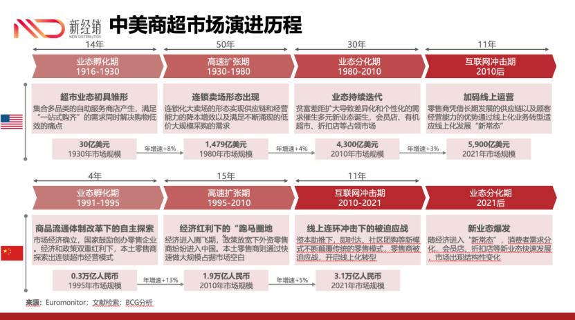 美国历经14年,超市业态才初具雏形;又历经50年,连锁卖场形态出现,不断提升自身供应链等经营能力,再过30年,开始进行差异化满足不同顾客群体的消费需求。到2010年电商崛起。