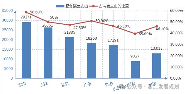 “藏富于民”的浙江,有持续发展服务消费的比较优势。浙江省发展规划研究院高级经济师厉晗隽、史丹萍等人撰文指出,2025年浙江居民人均服务消费支出位居全国第三、仅次于京、沪;占消费支出比重达47.3%,高于全国1.2个百分点。