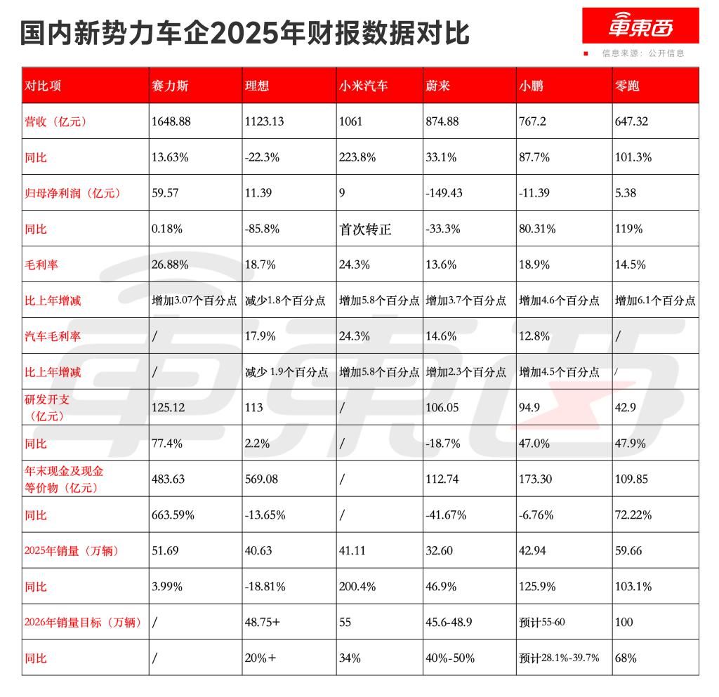 如果说5家传统车企的2025年是在规模与利润间艰难平衡,那么新势力阵营则上演了一场关于生存与突围的竞速,6家新势力集体“止亏”。