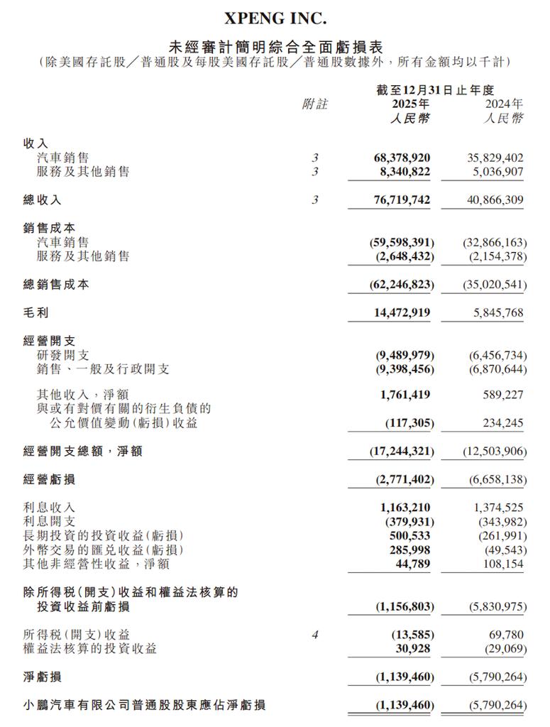 小鹏2025年全年财务数据