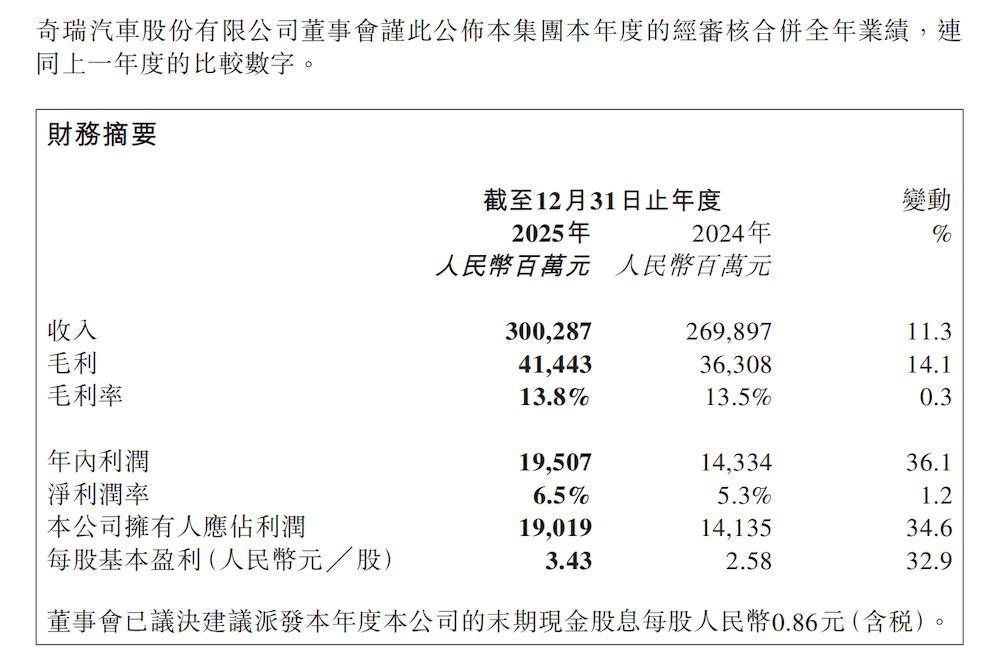 奇瑞也交出了其上市后的首份年报,2025年其营收达到3002.87亿元,同比增长11.3%,销量达到280.64万辆,同比增长7.8%,同样助推了营收增长。