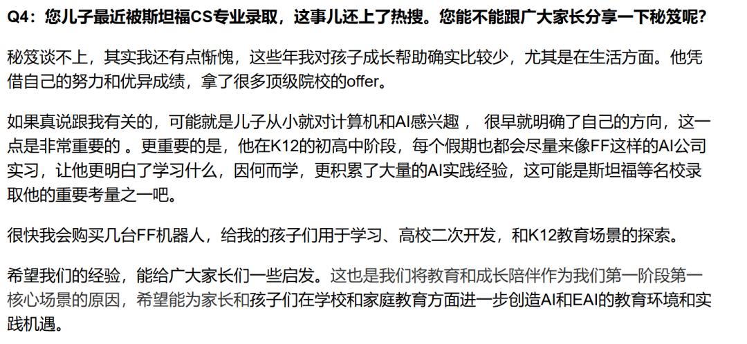 贾跃亭自己提到,除了他家娃从小对计算机类专业感兴趣,更重要的是,他在K12的初高中阶段,每个假期也都会尽量来像FF这样的AI公司实习,让他更明白了学习什么,因何而学,更积累了大量的AI实践经验,这可能是斯坦福等名校录取他的重要考量之一吧。
