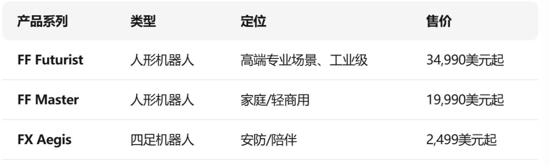 价格上来看,FX Aegis 系列起售价2490美元,支持二次开发的生态技能包价格为1000美元起。另外两款机器人分别为FF Futurist和FF Master,价格更贵。