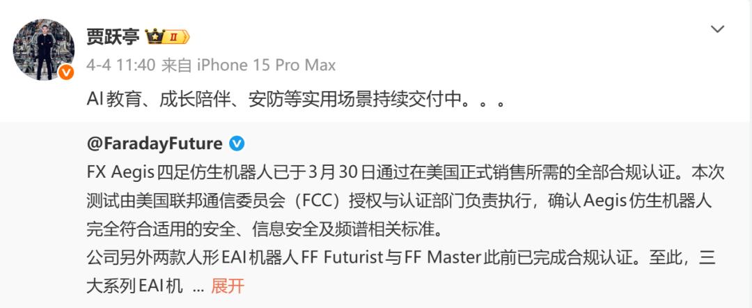 “3月是FF EAI机器人“首个交付月”,万事开头难,但我们实现了“开门红”。提前完成了包括人形机器人和仿生机器人在内的22台销售合同的签订,月底将超额完成首个交付月的20台出货目标,预计下周完成Aegis的FCC认证流程。这为首个交付季200台的出货目标开了个好头。”