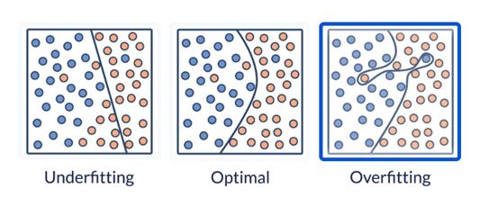 左图属于“欠拟合”,它只发现了蓝点大概在左边,橙点大概在右边,但界线太过简单;
