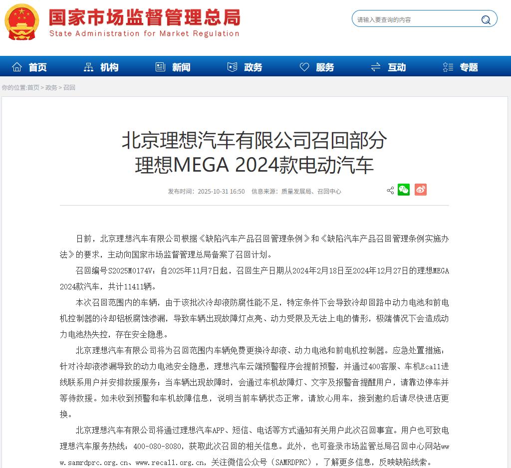 日前,北京理想汽车有限公司召回11411辆MEGA 2024款电动汽车,生产日期从2024年2月18日至2024年12月27日,本次召回范围内的车辆,由于该批次冷却液防腐性能不足,特定条件下会导致冷却回路中动力电池和前电机控制器的冷却铝板腐蚀渗漏,导致车辆出现故障灯点亮、动力受限及无法上电的情形,极端情况下会造成动力电池热失控,存在安全隐患。