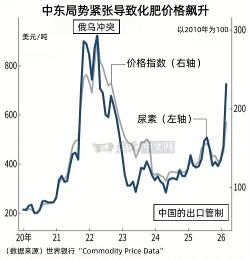 世界银行的高级农业经济学家约翰·巴菲斯分析称,“今年2月至3月天然气价格上涨约6成,尿素等的价格上涨”。他进一步指出,“中东运输路线的混乱不仅影响肥料和能源,还在对粮食生产必需的资材产生影响”。