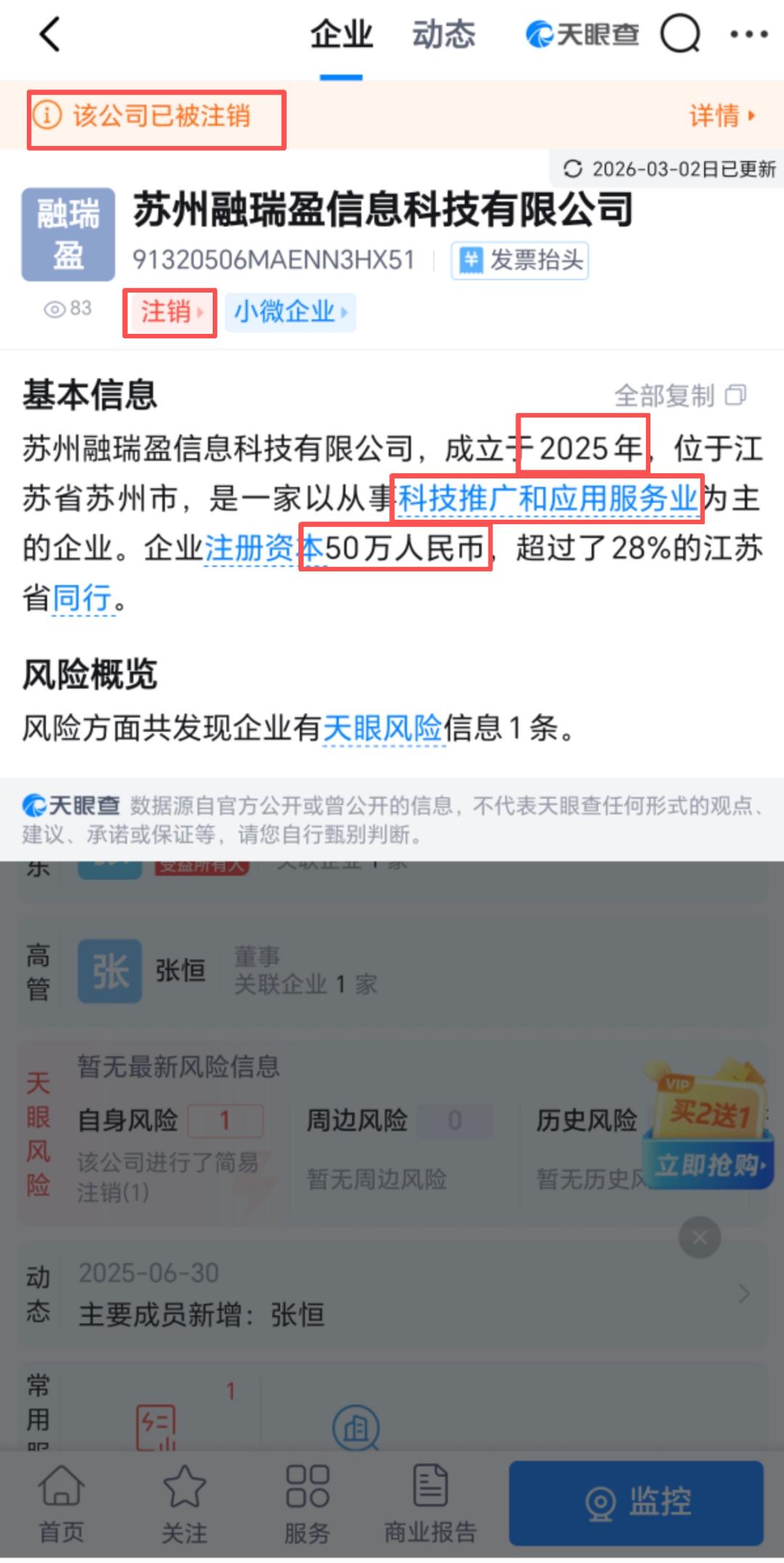 天眼查显示,这家公司成立于2025年6月30日,注册资本为50万元,定位是主要从事科技推广和应用服务业的企业,并无与金融相关的业务资质。2026年1月23日,公司注销。