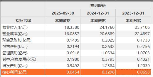 2025年前三季度,神剑股份的核心利润(营收-营业成本-税金及附加-销售、管理、研发、利息费用)只有0.045亿元,也就是超过18亿元的营收中,带来的营业利润只有几百万元,核心利润率只有0.25%,相当于每100元业务收入只有2毛多的营业利润。