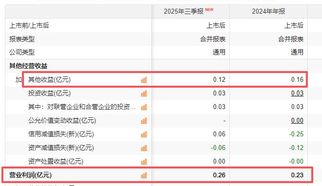 更尴尬的是,这利润本身可能还要“打上折扣”。2025年前三季度,其营业利润为0.26亿元,但以政府补助为主的其他收益占了0.12亿元,占比约46%;而2024年,在其0.23亿元的营业利润中,其他收益占了0.16亿元,占比更高达约7成。