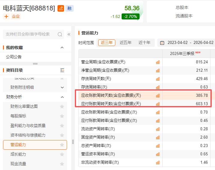就比如不久前上市、同样偏中游的电科蓝天来说,2022年至2025年三季度末,这家公司的应收账款由12.56亿元大增至26.66亿元,翻了一倍。Choice数据显示,目前电科蓝天的应收账款周转天数已经超过1年。