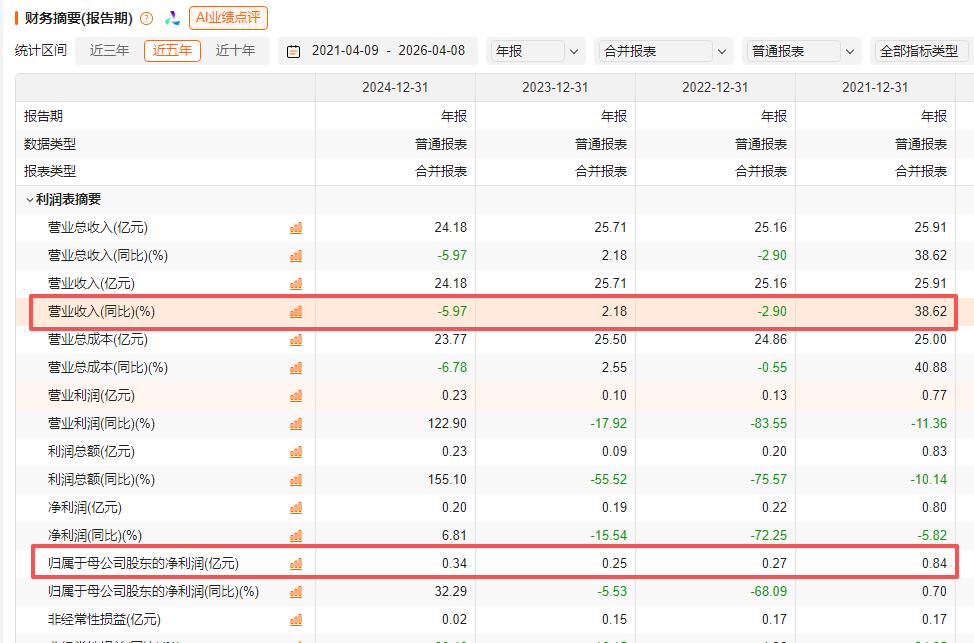 2021年,公司营收曾有过近40%的高光增速,但随后便坠入平庸。2022年至2024年,其营收增速在-6%到2.2%之间反复横跳,几乎陷入停滞;归母净利润更是直接从8000万元的高位“膝斩”,滑落至3000万元量级,直接下了不止一个台阶。